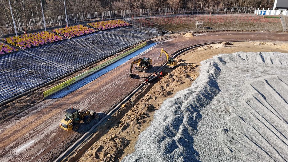 Zakończono już większość prac związanych z wykonaniem podbudowy – kluczowego elementu, który zapewni trwałość i odpowiednią amortyzację nowej nawierzchni. Równolegle modernizowany jest system odwodnienia, a na terenie stadionu instalowane są zbiorniki retencyjne. Deszczówka będzie wykorzystywana do nawadniania toru oraz terenów zielonych wokół obiektu.