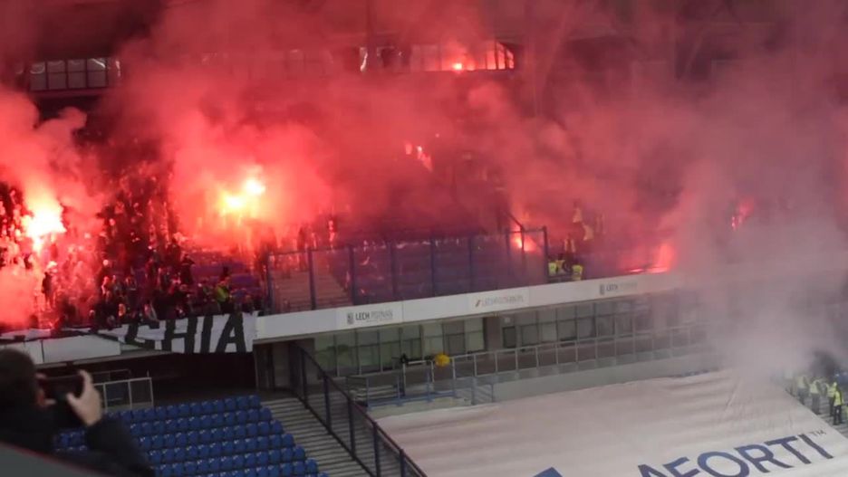 Sytuacja zagoniła się, gdy okazało się, że kibice Kolejorza ukradli zarekwirowane przez ochronę przed meczem transparenty fanów Lechii Gdańsk, a następnie wywiesili je na swojej trybunie do góry nogami i podpalili. Zachowanie rozwścieczyło przyjezdnych, którzy odpalili ponad 130 rac i zaczęli je rzucać w kierunku trybun zajmowanych przez kibiców gospodarzy. Ranna została m.in. młoda kobieta, która z poparzeniami trafiła do szpitala.
